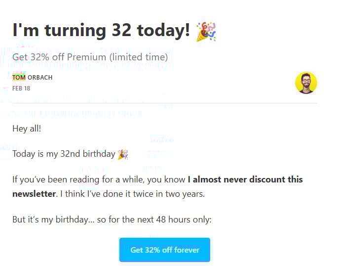 The birthday gives a reason for the discount and creates urgency.