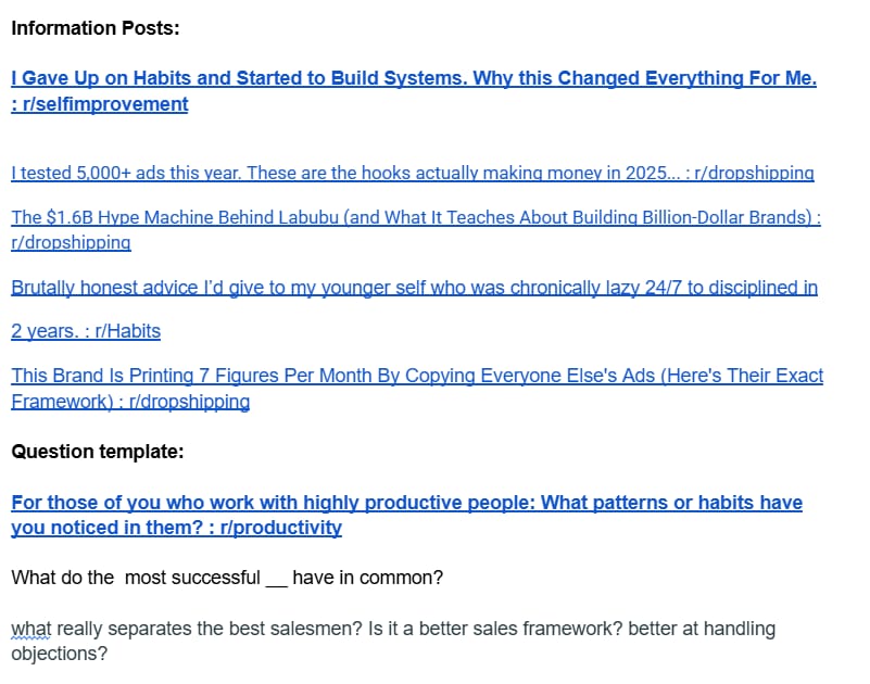 Here is a screenshot of my own swipe file for Reddit posts.